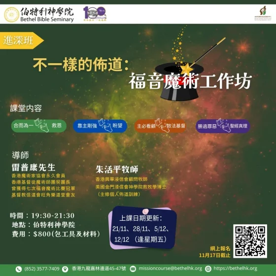 課程簡介 福音魔術佈道的概念與進階運用,示範及講解多套不同類型的近景及舞台福音魔術,演繹聖經故事及帶出真理和訊息。適合街頭佈道、團契、短宣等。 課程內容 合而為一 救恩 靠主剛強 盼望 主必看顧 效法基督 勝過罪惡 聖經真理 導師: 雷普康先生 香港魔術家協會永久會員 香港基督徒魔術師團契團長 曾獲得七次福音魔術比賽冠軍 基督教信道會旺角樂道堂會友 朱活平牧師 香港興華浸信會顧問牧師及美國金門浸信會神學院教牧學博士(主修個人佈道訓練) 對象:曾報讀【小型魔術工作坊】、【福音魔術工作坊】、或對福音魔術有基本認識的教牧同工或信徒 人數:20人 上課日期:21/11、28/11、5/12、12/12(逢星期五) 時間:19:30-21:30 地點:伯特利神學院 費用:$800 (包工具和材料) 截止日期:2025年11月17日 查詢 電話 / Whatsapp:+852 3577 7409 電郵: missioncourse@bethelhk.org