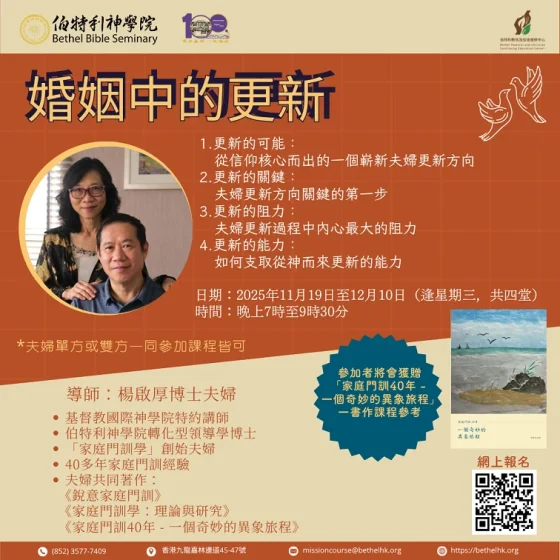 課程簡介 這課程的目的是讓學員經歷婚姻更新的可能性,內容是從講者夫婦40多年的家庭門訓經驗及神學院教學而出,透過引導及見證了很多生命的更新,歸納出一個可行的、可以讓神更新的方向。 課堂內容 第一堂 夫婦更新的可能:從信仰核心而出的一個嶄新夫婦更新方向 第二堂 夫婦更新的關鍵:夫婦更新方向關鍵的第一步 第三堂 夫婦更新的阻力:夫婦更新過程中內心最大的阻力 第四堂 夫婦更新的能力:如何支取從神而來更新的能力 導師:楊啟厚博士夫婦 基督教國際神學院特約講師 伯特利神學院轉化型領導學博士 「家庭門訓學」創始夫婦 40多年家庭門訓經驗 夫婦共同著作:《銳意家庭門訓》,《家庭門訓學:理論與研究》及《家庭門訓40年 - 一個奇妙的異象旅程》 *夫婦單方或雙方一同參加課程皆可。 *參加者將會獲贈「家庭門訓40年 - 一個奇妙的異象旅程」一書; 此書記載了許多家庭生命轉化的故事,乃本課程的重要參考書。 日期:2025年11月19日至12月10日(逢星期三,共四堂) 時間:晚上7時至9時30分 地點:伯特利神學院 費用:$800 查詢 電話...