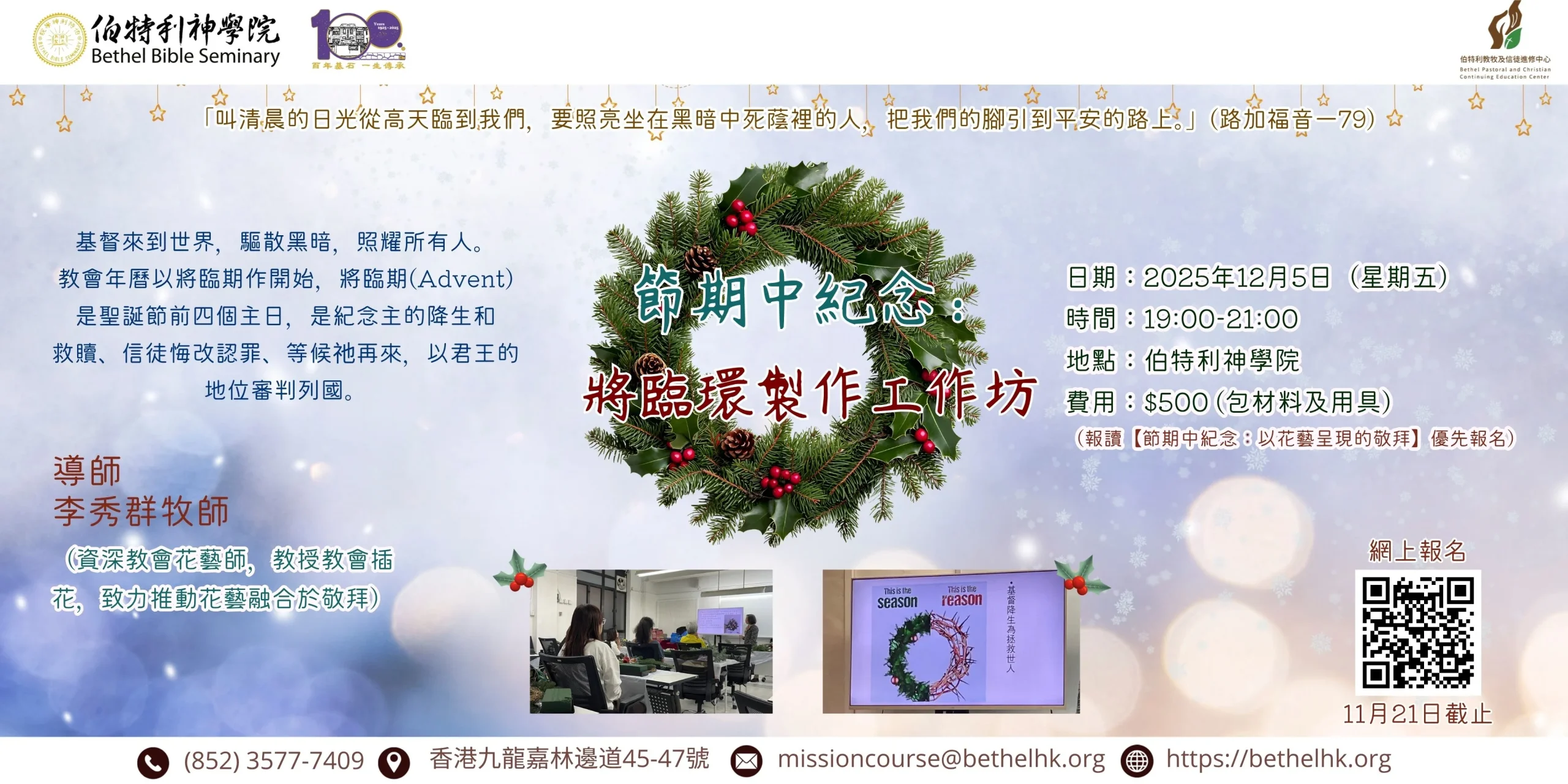 簡介 「叫清晨的日光從高天臨到我們,要照亮坐在黑暗中死蔭裡的人,把我們的腳引到平安的路上」(路加福音一79)。基督來到世界,驅散黑暗,照耀所有人。教會年曆以將臨期作開始,將臨期(Advent) 是聖誕節前四個主日。是紀念主的降生和救贖、信徒悔改認罪、等候祂再來,以君王的地位審判列國。 課堂內容 教會佈置會用將臨環(advent ring)象徵基督真光來臨。用長青樹,松枝、香柏木葉子,做成環形。加上果子,再放上四支蠟燭代表將臨期的四個星期。 第一主日「醒寤」,留心常作準備,因為不知道基督甚麼時候來到。 第二主日「悔改」,學習真誠祈禱,聆聽主的話,在愛中日漸成長。 第三主日「喜樂」信徒懷着喜樂的心等待,迎接祂的來臨。 第四主日「以馬內利」,主與我們同在。 將臨節花環上第五支白色蠟燭,象徵基督的光。在聖誕子夜的崇拜上點上,象徵基督的光已經臨到世間。 講員 李秀群牧師(資深教會花藝師,教授教會插花,致力推動花藝融合於敬拜) 日期:2025年12月5日(週五) 時間:晚上7時至9時 地點:伯特利神學院 費用:$500 (包材料及用具) 對象:教會花藝事奉人員及有興趣人士 (報讀【節期中紀念:以花藝呈現的敬拜】優先報名) 人數:15位(額滿即止) 截止日期:2025年11月21日 查詢 電話 / Whatsapp:+852 3577 7409 電郵: missioncourse@bethelhk.org