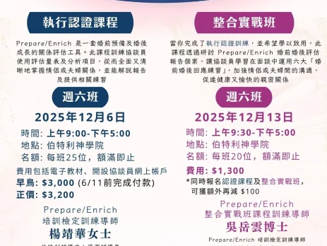 Prepare/Enrich 是一套婚前預備及婚後成長的關係評估工具。此課程訓練協談員使用評估量表及分析項目,從而全面又清晰地掌握情侶或夫婦關係,並能解說報告及提供相關練習。 日期:2025年12月6日(一) 時間:9:00AM - 5:00PM 地點:伯特利神學院 導師:楊靖華女士 名額:25位 費用: 早鳥:$3,000(6/11前完成付款) 正價:$3,200 截止日期:先到先得,額滿即止 講員介紹: Prepare/Enrich 培訓檢定訓練導師 楊靖華女士 伯特利輔導中心資深輔導員 伯特利神學院客席講師 香港專業輔導協會副院士 基督教婚姻及家庭治療碩士 查詢 :WhatsApp +852 3586 0399 立即網上報名