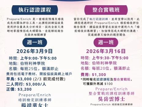 Prepare/Enrich 是一套婚前預備及婚後成長的關係評估工具。此課程訓練協談員使用評估量表及分析項目,從而全面又清晰地掌握情侶或夫婦關係,並能解說報告及提供相關練習。 日期:2026年3月9日(星期一) 時間:9:00AM - 5:00PM 地點:伯特利神學院 導師:楊靖華女士 名額:25位 費用: 早鳥:$3,000(2/3前完成付款) 二人同行:$3,000 / 人 正價:$3,200 截止日期:先到先得,額滿即止 講員介紹: Prepare/Enrich 培訓檢定訓練導師 楊靖華女士 伯特利輔導中心資深輔導員 伯特利神學院客席講師 香港專業輔導協會副院士 基督教婚姻及家庭治療碩士 查詢 :WhatsApp +852 3586 0399 立即網上報名